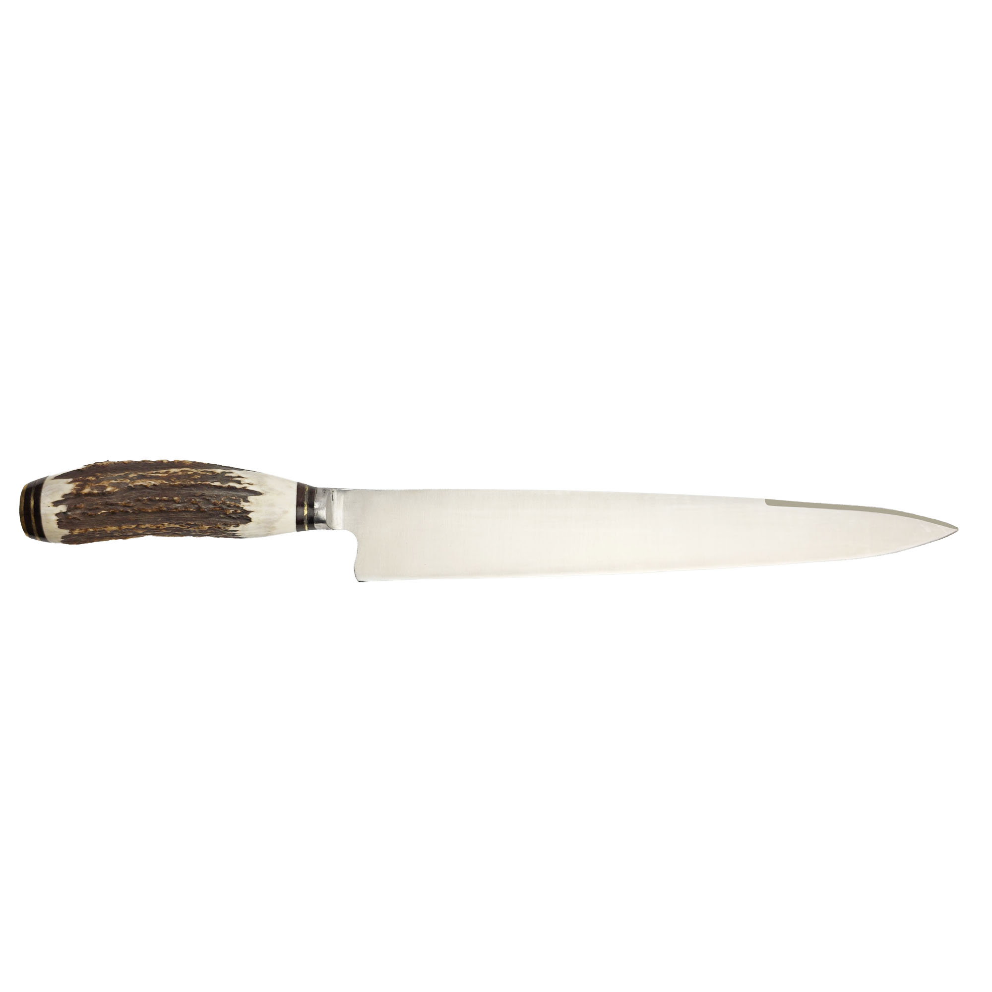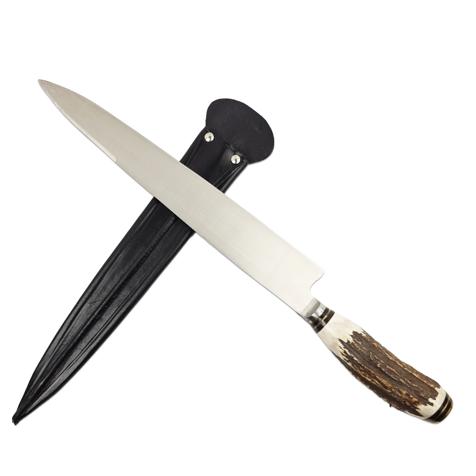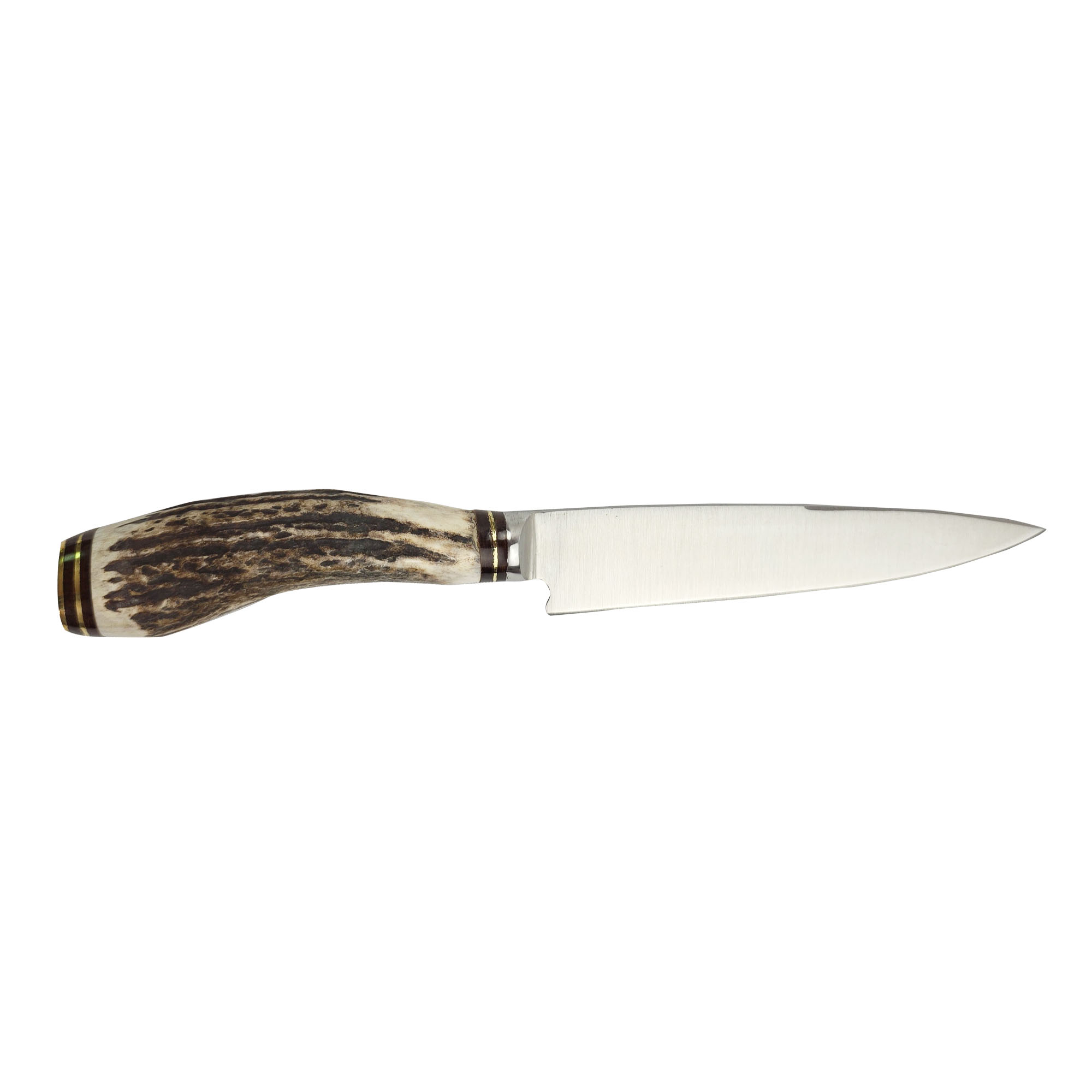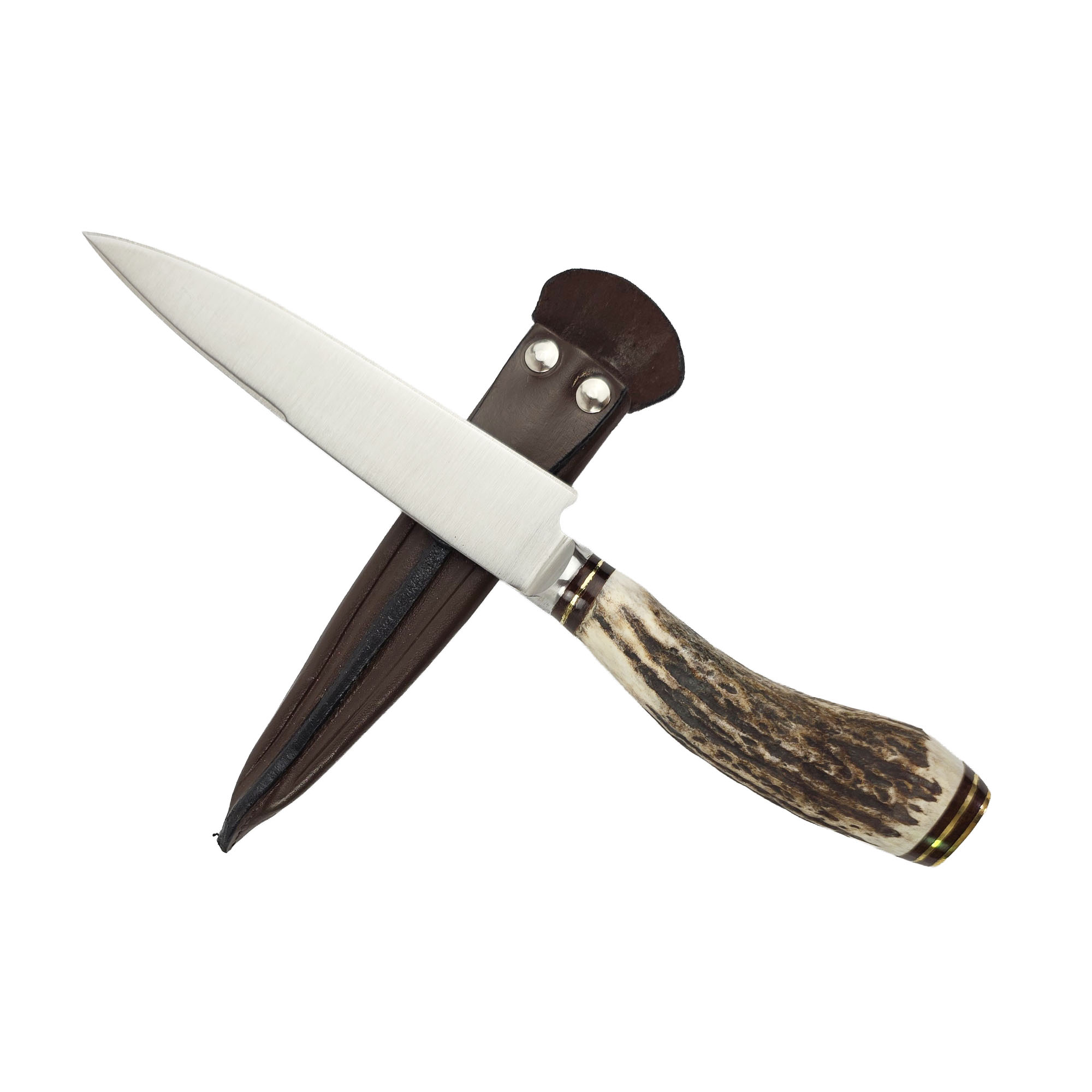 Cuchillo con cabo de asta de ciervo entero. Con hoja de acero inoxidable 420. Vaina de vaqueta.